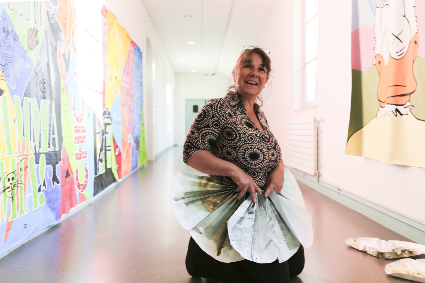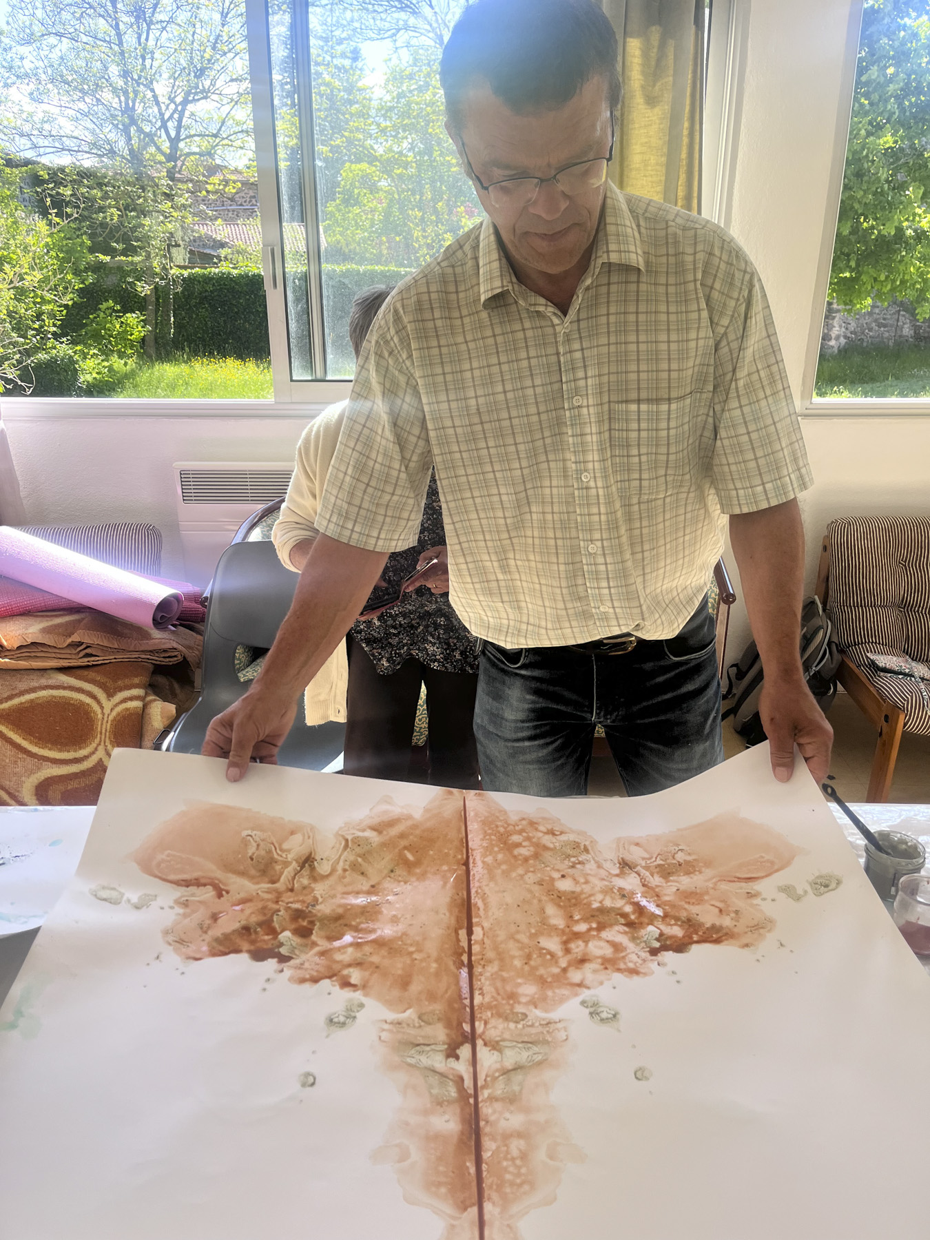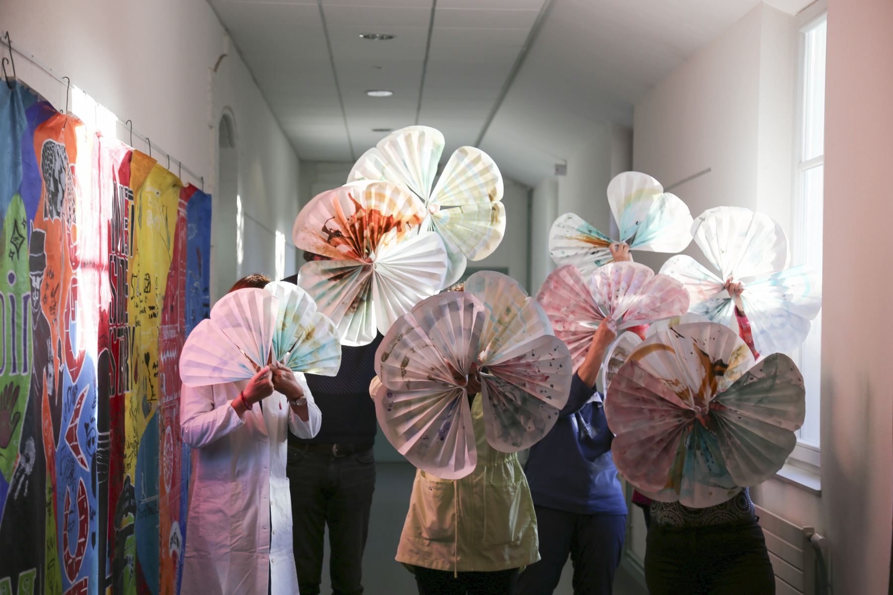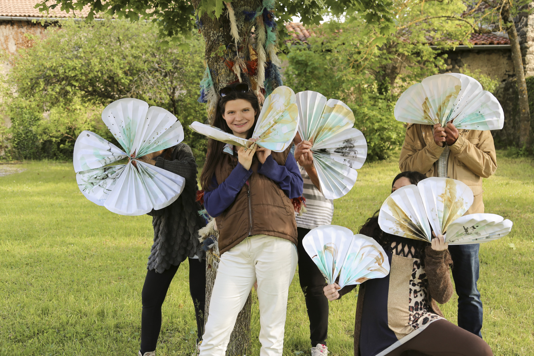 Les bénévoles de «Dis-moi où tu vis» et les élèves des Ateliers des Arts ont créé des éventails à partir d'encres naturelles à base de matières collectées pendant l'enquête. Le premier atelier a proposé une initiation à l'extraction de pigment et à leur transformation en encre. Nous avons abordé les oxydation avec les oxydes de cuivre et de fer, les encres végétales par infusion/décoction et le broyage de pigment.